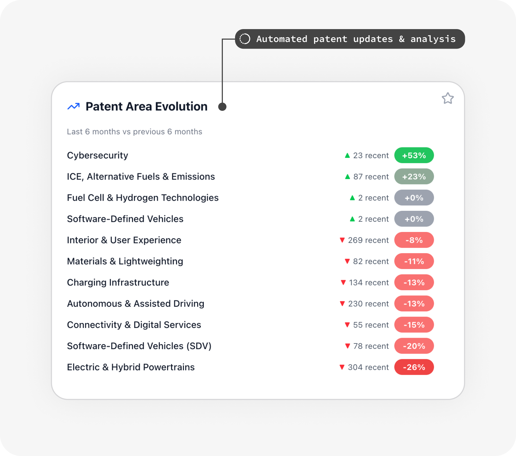 See where competitors are ramping up or pulling back R&D, with automatic updates from the latest patent filings.